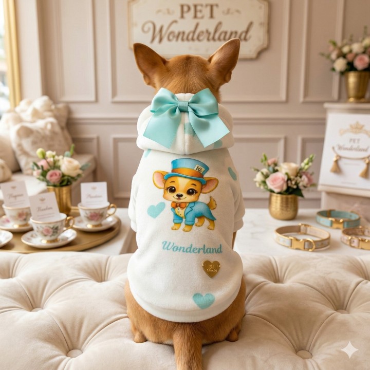 Keywords: felpa cane Mad Hatter, sweatshirt ciniglia chihuahua, abbigliamento barboncino pizzo tulle, Tiffany pet piccola taglia, Cappellaio Matto cane.